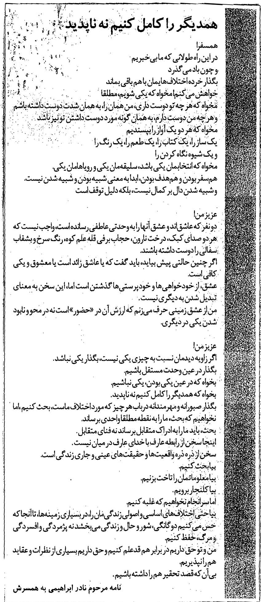 نامه جناب نادر ابراهیمی است به همسرش. این نامه را قدیم ها من داده بودم به خاتون و حالا فراموش شده بود...